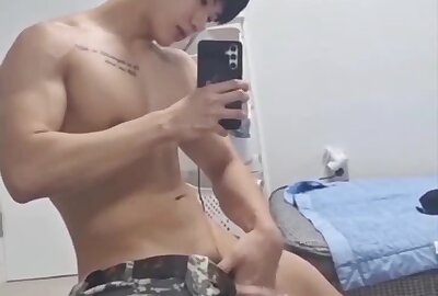 Inked soldier Big Saint jerks off his thick cock with a firm grip