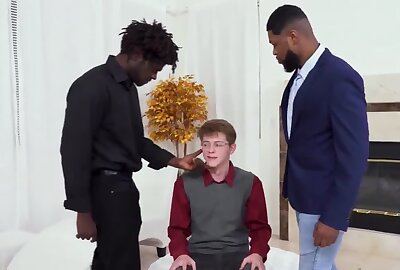 Nerd boy gets pounded and spit-roasted by two black cocks